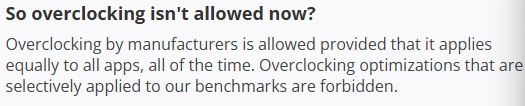 3Dmark的基准轨则中泄露,手机不允许针对基准测试职责进行“优化”。过往便有很多居品因检测到3DMark开动时接收不同时刻提高性能而被3DMark下架。
